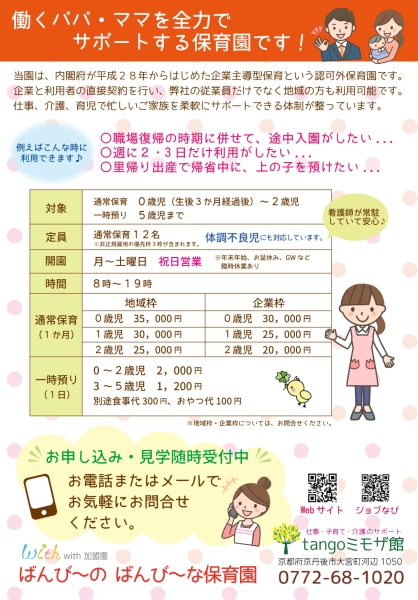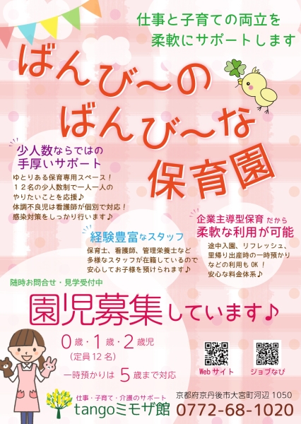 2022.12.08 ばんび~のばんび~な保育園では園児を募集しています。 保育園では、随時園児を募集しています。職場復帰をしたい保護者の方は、年度途中であってもお子様を預けていただけますので、是非ご検討ください。また、急な用事やリフレッシュ目的、里帰り中などの一時的な利用も可能となっておりますので、お気軽にお問合わせください。